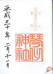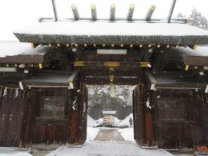Some of the soldiers were from the Watari-Date clan of the Sendai clan, and Shigezane Date was enshrined as the god Takehaya Chio. At first, it was called Takehaya Shrine, and a small shrine was built in the precincts of Nitoji Temple. After that, it was placed on Mizukami-dori (the west side of Kotoni Junior High School), which was donated by Mr. Shigesaburo Saito. At this time, Kuninari Date, the 14th feudal lord of Watari, who had settled in Usu-gun, Hokkaido, donated a jinbaori and a hanging scroll handwritten. It is said that in the Meiji era, the residents of Kotoni Village were the parishioners, and in the Meiji era, the annual festival with stalls, a play, and a gramophone was enjoyed by all the villagers. (quoted from Wikipedia)
